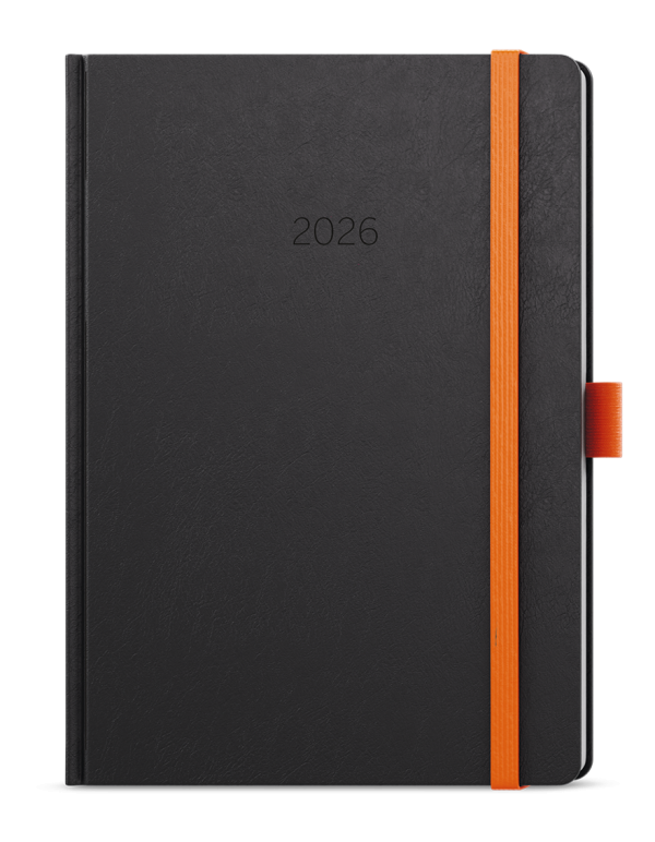Neobyčejný týdenní diář s matným povrchem ze strukturovaného materiálu s oranžovou gumičkou a poutkem. Je vyráběný ve formátu A5, má velký prostor pro poznámky a plánování.