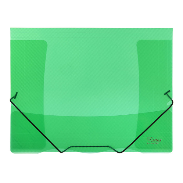 Desky se třemi chlopněmi. Uzavírání pomocí gumičky. Materiál polypropylen, síla 400 mic. Roztažitelný hřbet až 3,0 cm. Kapacita 250 listů. Pro formát A4. Barvy s vysokým leskem. Barva zelená.